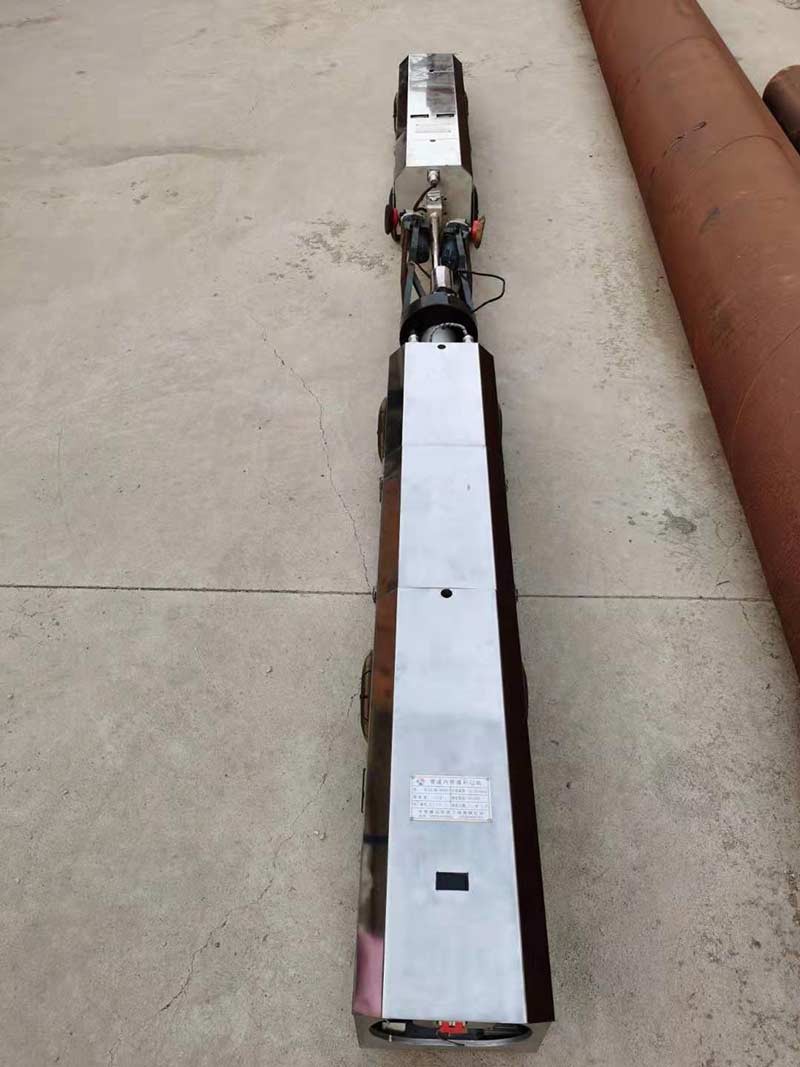 400補(bǔ)口機(jī)屬于空心工件內(nèi)表面噴涂液體及預(yù)處理設(shè)備。由驅(qū)動(dòng)、行走、除銹、吸塵、噴涂、監(jiān)控和電源七部分組成。機(jī)體為三節(jié),用鉸軸球頭組件聯(lián)接成一體。后部有行走電機(jī)驅(qū)動(dòng)主動(dòng)輪,五對(duì)從動(dòng)輪安裝在中部和前部。除銹部分由一個(gè)電機(jī)帶動(dòng)旋轉(zhuǎn)架旋轉(zhuǎn),旋轉(zhuǎn)架上安裝三個(gè)小電機(jī)帶動(dòng)鋼刷旋轉(zhuǎn)除銹。用吸塵器吸收銹塵。噴涂電機(jī)帶動(dòng)旋杯高速旋轉(zhuǎn),把液體涂料甩噴到焊口區(qū)域。能在直徑700~1000毫米管道內(nèi)深達(dá)1公里以上自進(jìn)自出。用無(wú)線(xiàn)遙控和視頻圖像直觀,完成焊口定位、除銹、吸塵、噴涂全過(guò)程焊口補(bǔ)口作業(yè)。自動(dòng)化程度和工效高,補(bǔ)口質(zhì)量好,為國(guó)內(nèi)管道施工提供了一種機(jī)、電、訊一體化自主創(chuàng)新設(shè)備,具有推廣應(yīng)用價(jià)值。