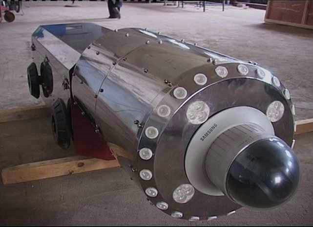 管道內(nèi)觀察機是一臺機、電、訊、光一體化的自動觀察作業(yè)小車,包括攝像觀察機頭和機身兩大部分。機頭分為旋轉(zhuǎn)和固定兩部分。機身包括變徑調(diào)節(jié)機構、機載收發(fā)信號系統(tǒng)、機載控制系統(tǒng)、蓄電池組和驅(qū)動行走機構。機頭旋轉(zhuǎn)部分內(nèi)裝攝像機和云臺,由電機帶動可向右擺動90度。機頭固定部分內(nèi)裝電機及傳動機構,能帶動機頭旋轉(zhuǎn)部分轉(zhuǎn)動360度。機身前端通過燕尾式插槽、插板與機頭連接成一體。變徑調(diào)節(jié)機構采用燕尾滑板、滑道結構,用絲杠、絲母調(diào)節(jié)機頭上、下移動處于管道中心。驅(qū)動行走機構在機身后部,其余在機身前部和中部。主要用來觀察管道焊縫內(nèi)表面缺陷和管內(nèi)有無異物及施工質(zhì)量有無問題,以便及時處理。